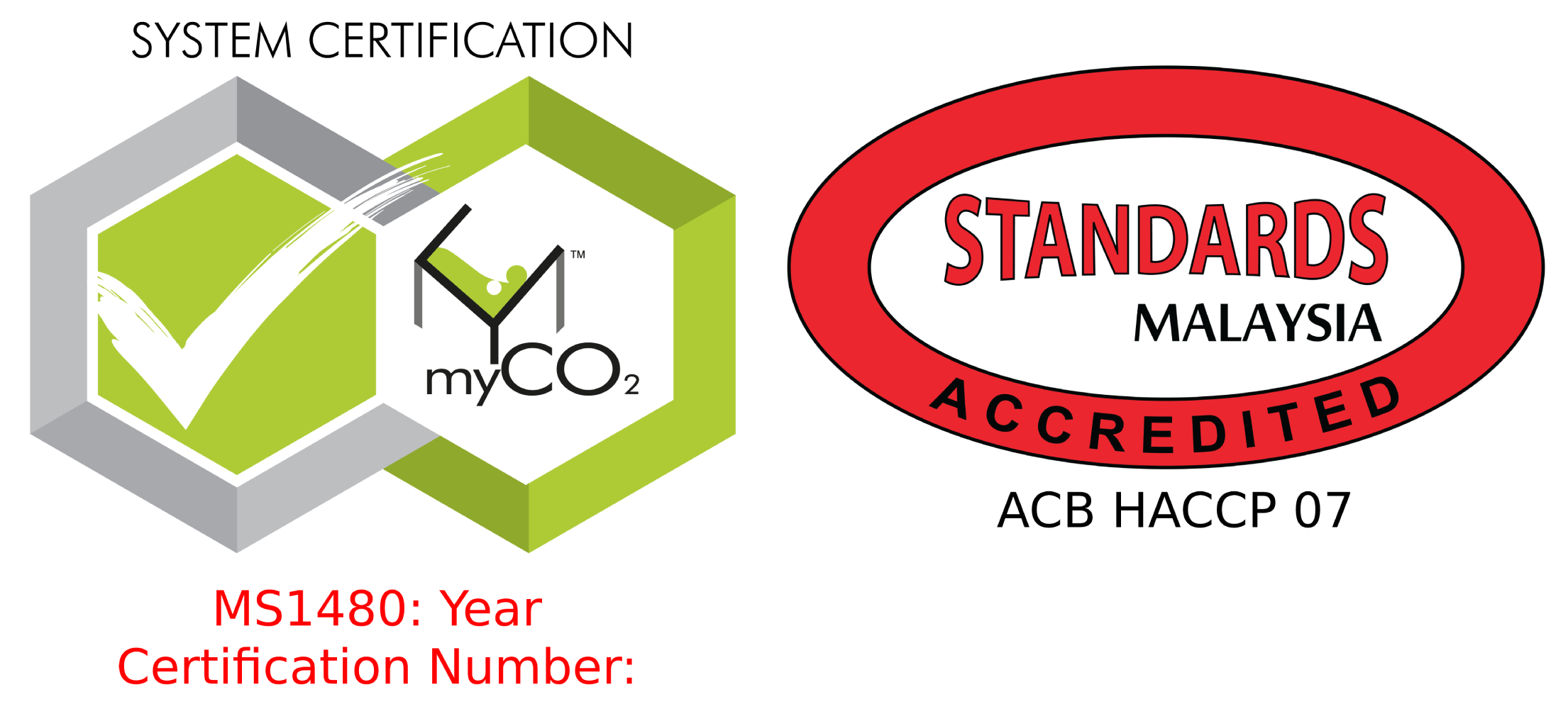 • The certification mark shows that the firm has been certificated by MYCO2 to ISO 9001, ISO 45001, ISO 22000, MS 1480 and GMP.